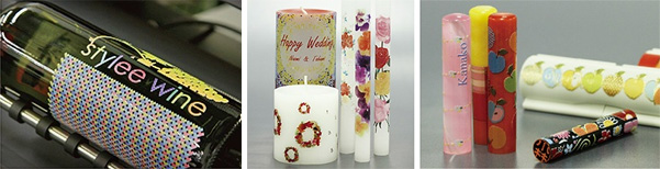 С помощью опции Mimaki Kebab можно за один рабочий цикл декорировать или персонализировать такие предметы, как бутылки, банки, флаконы, цилиндрическую упаковку, свечи, канцелярские пеналы, косметические принадлежности, кухонные емкости и предметы утвари, стаканы, вазы и пр.