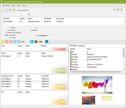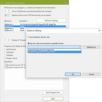 Ergosoft RIP 15 позволяет использовать до 8-ми модулей RipServer одновременно, что дает возможность наиболее эффективно использовать ресурсы компьютера. Более того для каждого PrintClient можно настроить собственный RipServer, что позволяет гибко настраивать Ergosoft RIP под нужды производства.