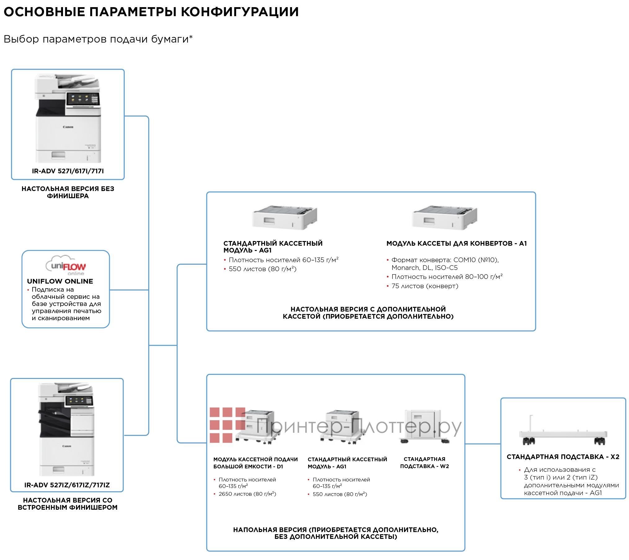 На изображении представлены основные опции Canon imageRUNNER ADVANCE DX 717i. Для подбора конфигурации под свои задачи вы всегда можете обратиться в отдел продаж Принтер-Плоттер.ру.