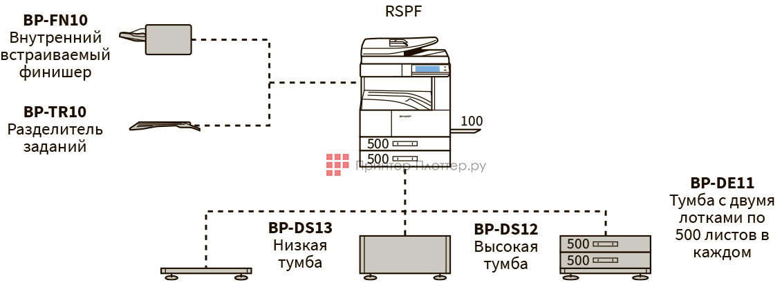 На изображении представлены основные опции Sharp BP-30M35EU. Для подбора конфигурации под свои задачи вы всегда можете обратиться в отдел продаж Принтер-Плоттер.ру.