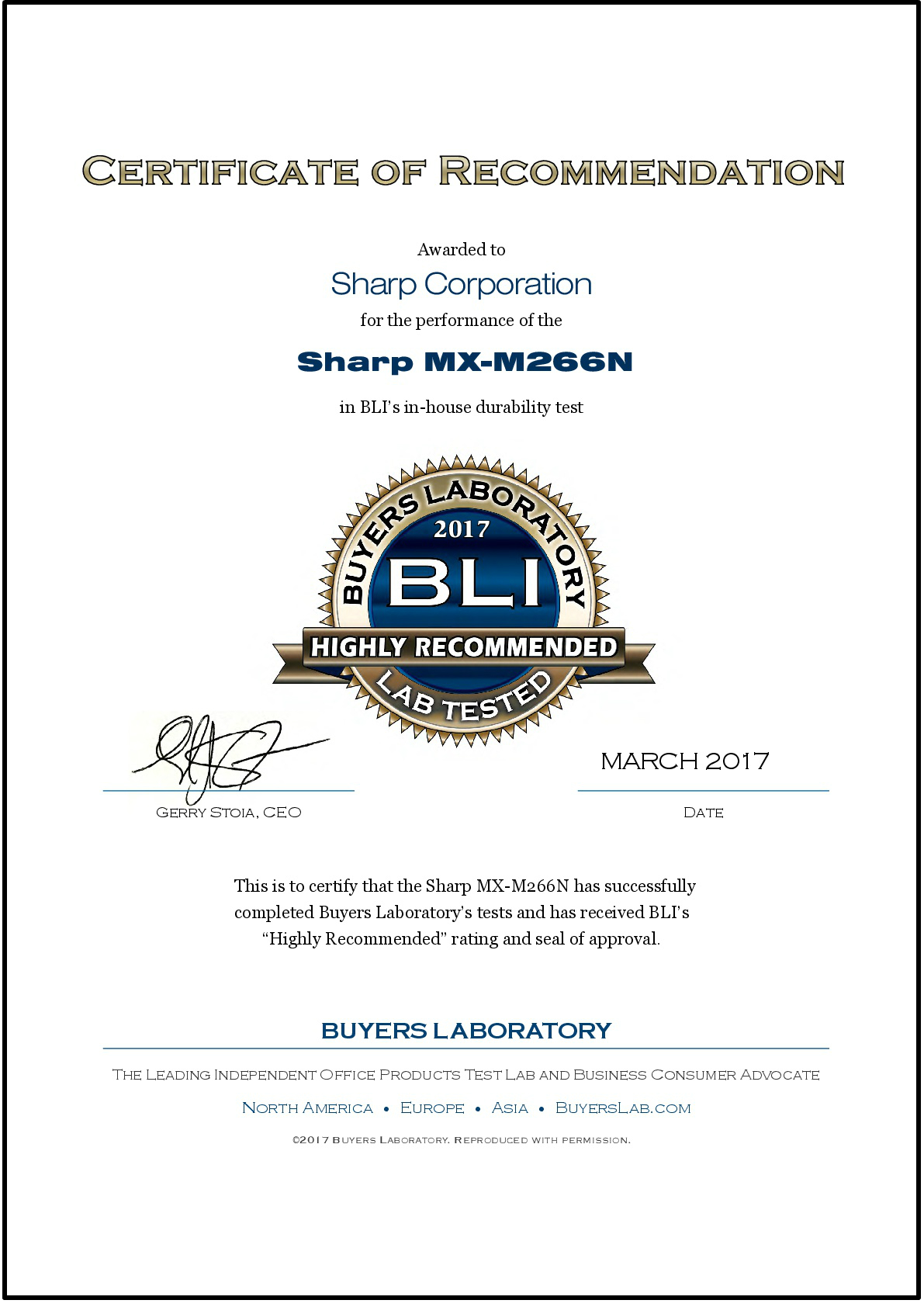 МФУ Sharp MX-M266N — обладатель сертификата надёжности Buyers Lab ("BLI Reliability Certified 2017"):