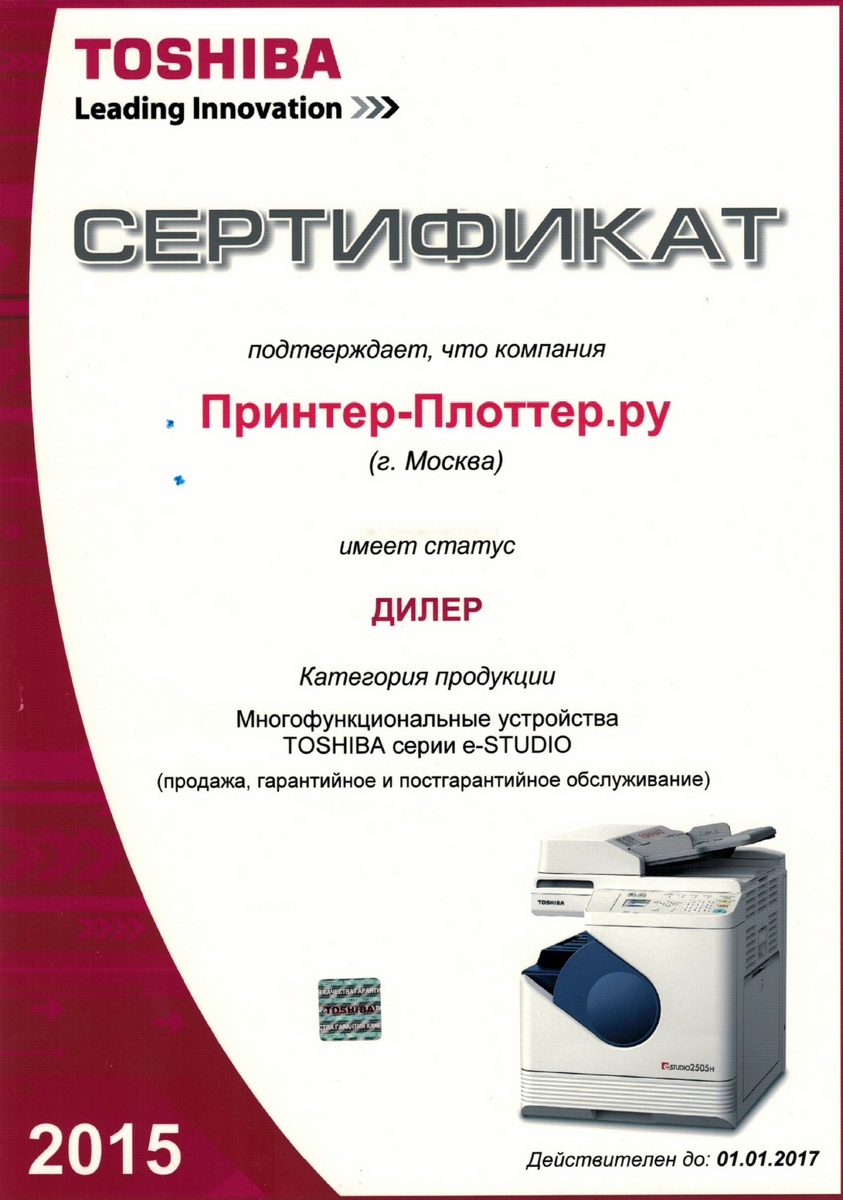 Список сертификатов Принтер-Плоттер.ру обновлен — магазин вновь подтвердил свой статус официального дилера Toshiba и получил обновленный сертификат на новый отчетный период.