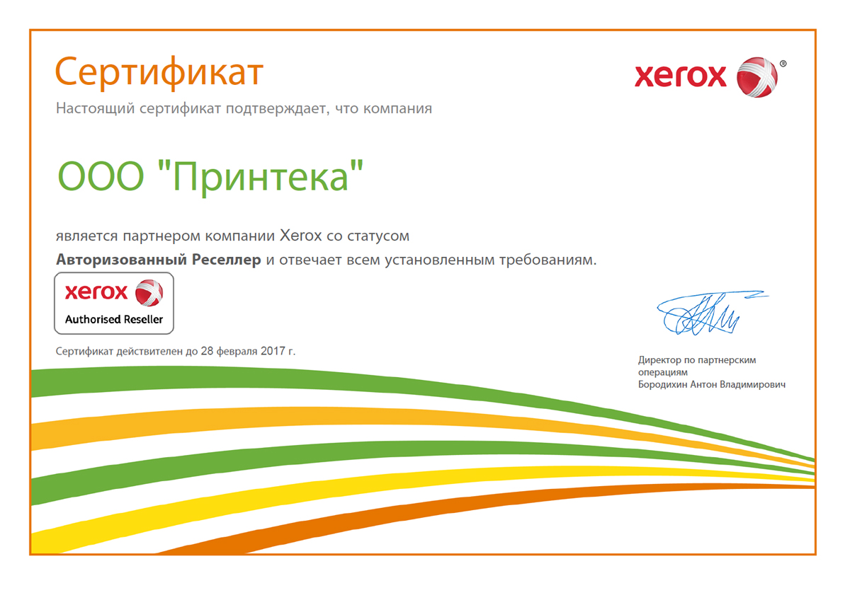 Список сертификатов Принтер-Плоттер.ру обновлен — магазин вновь подтвердил свой статус официального дилера Xerox и получил обновленный сертификат на новый отчетный период.
