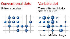 Высокая степень детализации и низкая зернистость отпечатков достигается благодаря технологии трехуровневой переменной капли (variable dot). Разрешение при печати — до 1440 dpi. Даже при печати в четырехцветном режиме получаются прекрасные изображения с мягкими переходами между полутонами, лишенные эффекта зернистости.