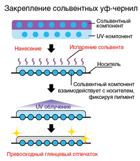 Сольвентные УФ-чернила состоят как из сольвентного пигмента, так и из УФ. Сольвентный пигмент обеспечивает гладкую и глянцевую поверхность отпечатка, а также отличную цветостойкость, когда как УФ-пигмент гарантирует стойкость и высокую сопротивляемость к царапинам и атмосферным осадкам.