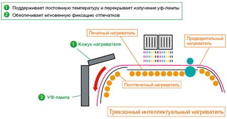3-х уровневый интеллектуальный нагреватель улучшает цветопередачу и стойкость чернил при нагревании материала до необходимой температуры до, во время, и после печати. В сочетании с 3-х уровневым интеллектуальным нагреванием, устройство УФ-отвержения сразу отвержает чернила для фиксации.