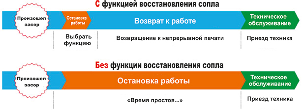 При выходе из строя одной, либо нескольких дюз, оператор может перенастроить работу печатающей головы без прерывания целостности изображения и потери качества печати.