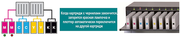 В плоттеры Mimaki JV400 устанавливаются сразу два комплекта цветных картриджей, печать идет только с одного комплекта, при минимальном остатке чернил в картридже, автоматически происходит переключение на дублирующий картридж.