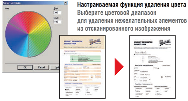 Настраиваемая функция удаления цвета даёт возможность исключать нежелательную цветную графику, включая линии и рамки, из итогового изображения. Вы получаете более чёткие изображения, что означает повышение эффективности оптического распознавания символов и меньший размер файлов. Это особенно полезно при сканировании форм. Интеллектуальные функции, такие как автоматическое определение формата, выравнивание, пропуск пустых страниц, определение ориентации текста и удаление следов перфорации, гарантируют профессиональное качество обработки документов.