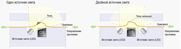 Оригинал при сканировании подсвечивается двумя LED-источниками света, расположенными по обе стороны считывающего элемента CIS. Как показано, на рисунке, такая система позволяет более качественно подсвечивать оригиналы с проблемными участками (морщинами, складками и т.п.). В этом случае практически исчезают области тени, которые могут образовываться на копиях и сканах при одном источнике освещения.