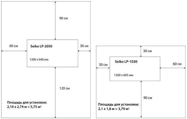 Ниже на рисунках показано место требуемое для установки и обслуживания инженерных систем Seiko LP-1030 MF-1R, LP-1030 MF-2R, LP-2050 MF-4R. Как видно из рисунка: