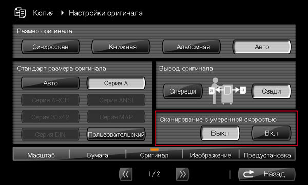 Вместе с тем в аппарате предусмотрен режим протяжки с умеренной скоростью. В этом случае сканер снижает скорость протяжки до 60 мм /с. Такой режим целесообразно использовать для протяжки ветхих и проблемных оригиналов.