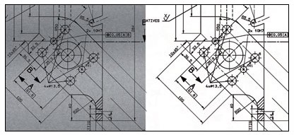 Как известно, зачастую на российских предприятиях приходится решать задачу копирования документов, которые сохранились только на синьках (синька — это копия, полученная на светокопировальном аппарате). Иногда синьки нужно сохранять в электронном архиве. Во всех этих случаях важно, чтобы инженерная система путем анализа отсканированных данных могла качественно подавить фон, при этом не потеряв существенных деталей чертежа или даже усилив тонкие линии.