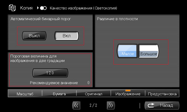 При ручном подавлении можно вручную выставить порог бинаризации (от 0 до 255). При сканировании конкретного оригинала аппарат выводит подсказку по рекомендованному значению порога бинаризации для данного конкретного оригинала. Еще одна настройка — параметр различия плотности фона по площади оригинала: сильное различие или слабое различие. Все эти настройки позволяют аппарату Seiko справиться с синькой любой сложности, в том числе с неравномерным фоном.