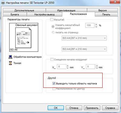При печати с компьютера в драйвере принтера можно выбрать функцию обрезки полей не содержащих информации. Например, если вы задали печать на пользовательском формате бумаги 1000 х 594 мм, а файл имеет реальный размер 841 х 594 мм, то принтер обрежет бумагу по размеру 841 х 594 мм, то есть распечатает только область, содержащую данные. Для этого в драйвере необходимо выбрать установку " Выводить только область чертежа".