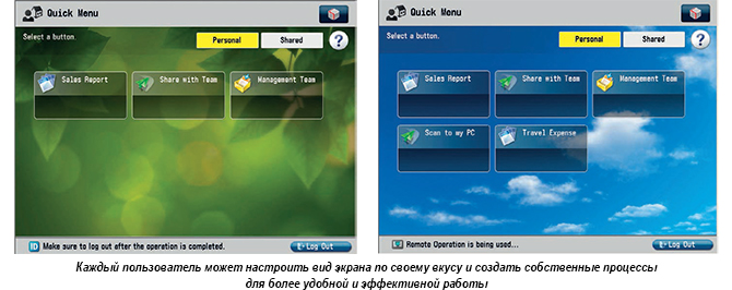 Все устройства серии imageRUNNER ADVANCE рассчитаны на совместное использование, однако они также предоставляют возможности для персонализации. Войдя в систему, пользователь получает индивидуальное рабочее пространство, которое он может настраивать по своему вкусу. Так, можно создать отдельные кнопки для быстрого запуска часто выполняемых задач, таких как сканирование в бизнес-приложения или отправка документов на адреса групп. Пользователь может выбрать фоновое изображение для сенсорного экрана, настроить вид и размер кнопок.