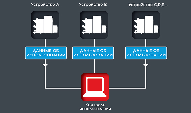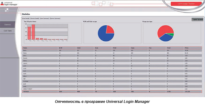 С помощью отчетов можно легко контролировать активность пользователей и использовать эту информацию для выявления потенциальных возможностей экономии, таких как, например, использование двусторонней или черно-белой печати. Требуемые меры могут быть внедрены с помощью встроенной системы управления доступом, позволяющей ограничивать пользование определенными функциями устройства, такими как сканирование и отправка или копирование и печать в цвете, на уровне отдельных пользователей. Это помогает управлять расходами, а также создать дополнительный уровень контроля доступа к устройству.