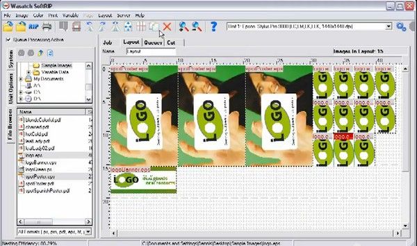 Пример рабочей области Wasatch SoftRIP. Из окна слева изображения одним движением переносятся вправо, после чего с помощью функции автоматической компоновки плотно занимают пространство холста по ширине рулона оптимальным образом. |